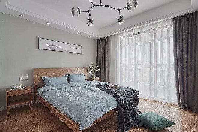 床头背景墙刷成浅青色,一侧的衣柜门设计成无把手,更加高级和干净利落。