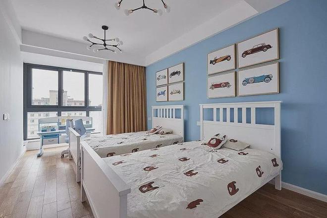 卧室的颜色采用原木色、蓝色、青色和灰色的结合,构造出这个文艺小清新的卧室。