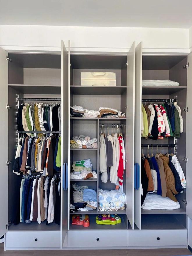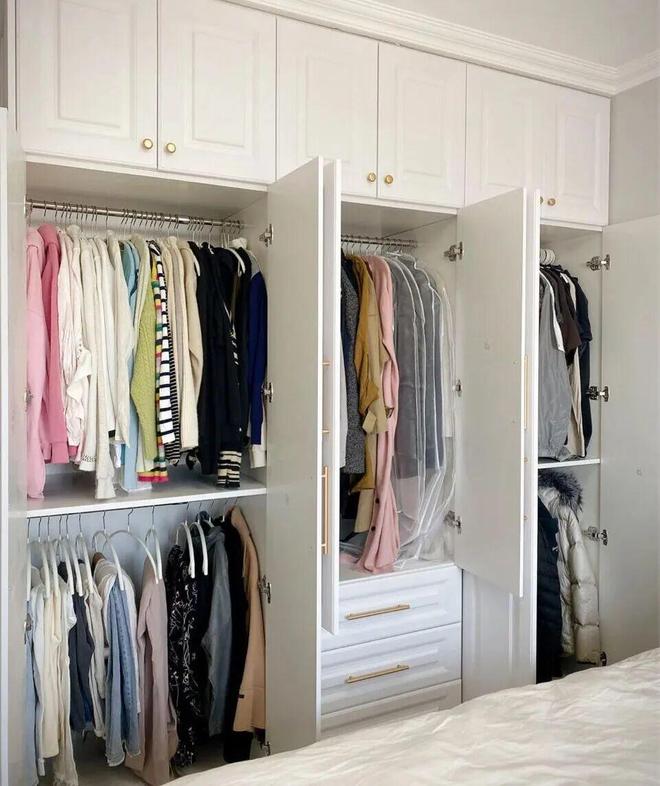 所以,我们在设计衣柜时只做挂衣区和抽屉就够了,能挂的就全部挂起来,不能挂的用抽屉收纳就够了。