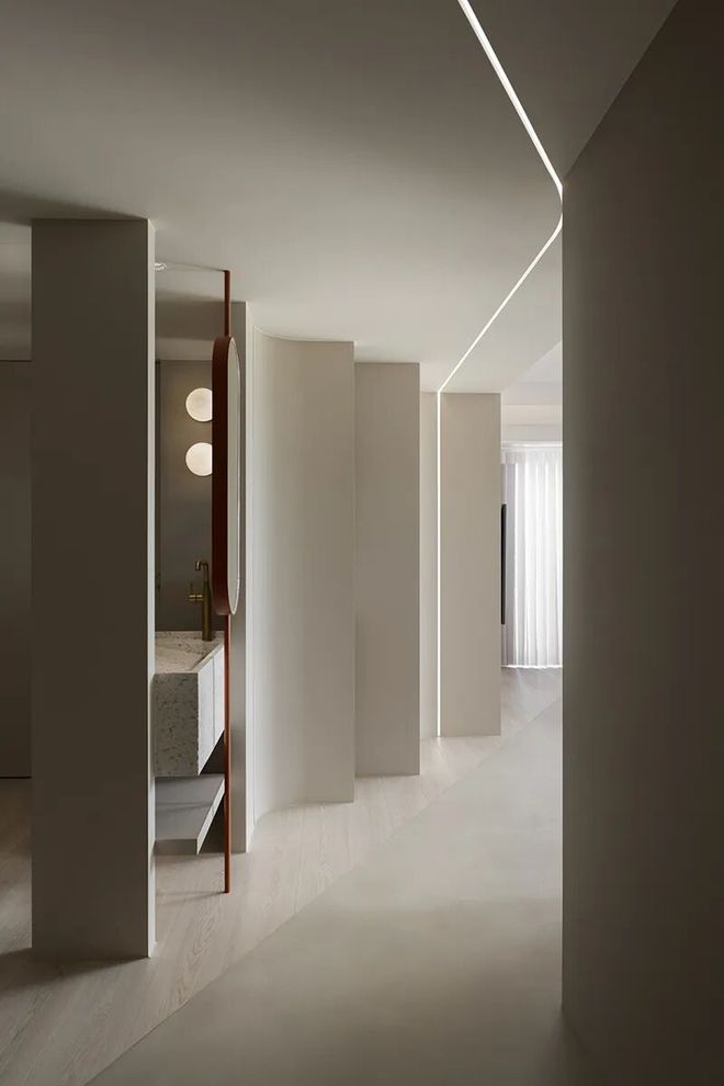 搭配柔和光氛与圆弧修饰的天花板