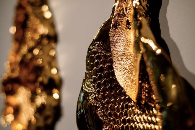 这些作品不加修饰地陈列,却覆以精致蕾丝或金箔,形成强烈反差。