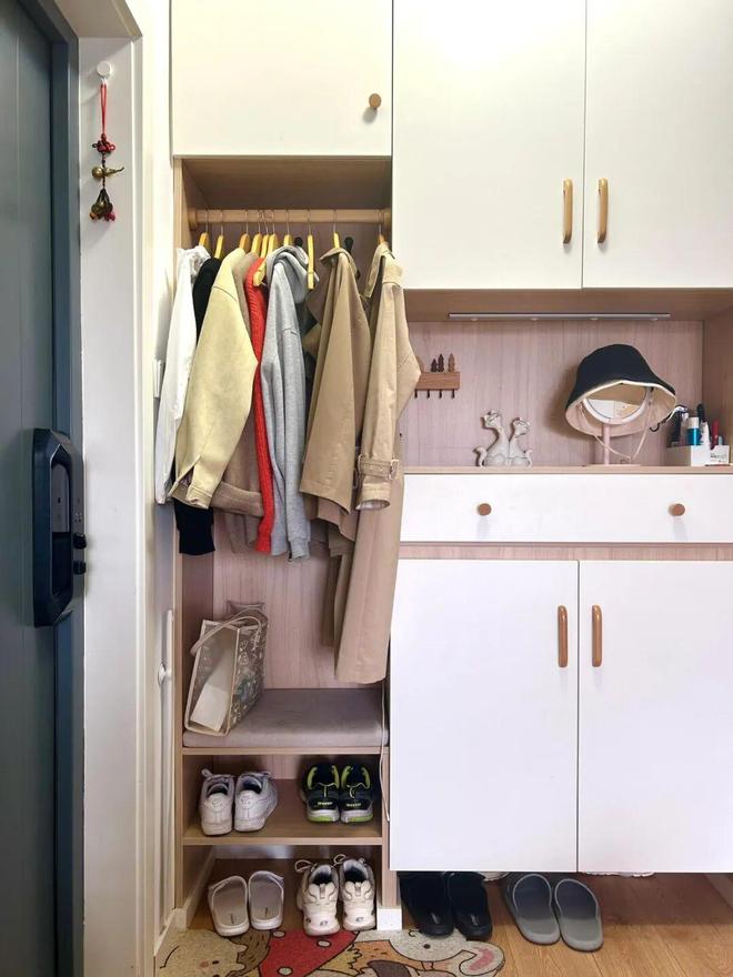 网友@我想有只猫:我家玄关倒是有个小衣柜,但由于没有做柜门,衣服挂上去显得特别乱,有条件的家庭还是做全封闭设计吧。