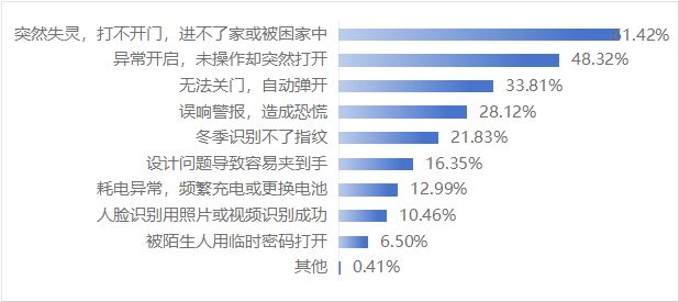 功能失灵突出:61.42%的受访者曾遭遇门锁突然失灵、无法开门的困境;48.32%遇到门锁异常开启;33.81%反映存在无法正常关门的情况。