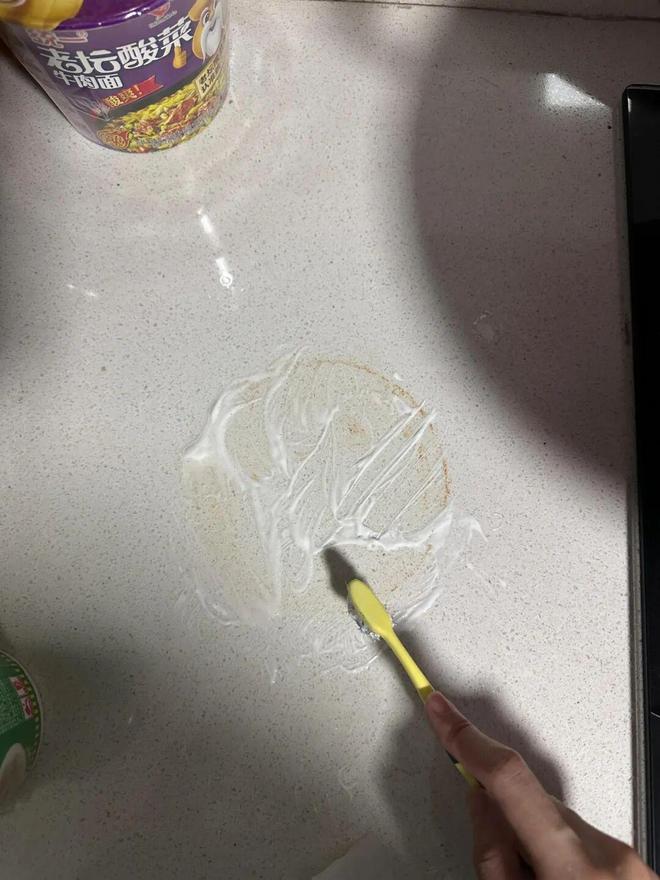 网友@水煮美人鱼:偷懒没刷锅的结果,就是台面留下了锈印,网上都说用牙膏可以刷掉,但效果比较一般,现在头都大了。