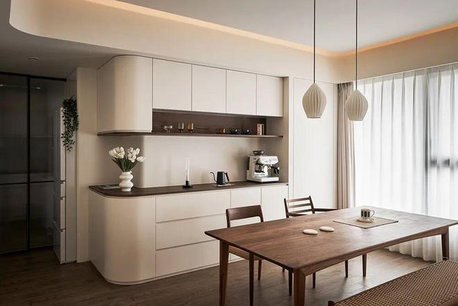 餐边柜採 L 型设计,转角处予以圆弧修润