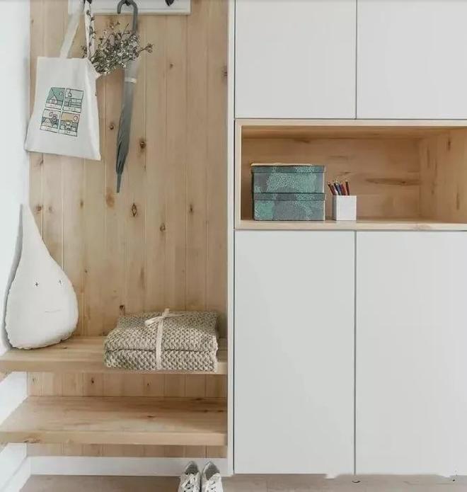 北欧风新房入户,绿色的装点加上原木的设计,清新舒适又美观!
