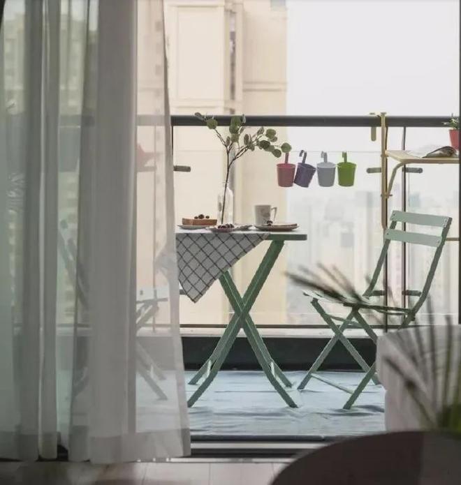 阳台不仅仅只是晾晒衣服的区域,还是个休闲区,摆放了一张休闲餐桌椅在阳台上,周末都可以直接在家看书工作或者是喝咖啡了,十分的惬意,你们觉得呢?