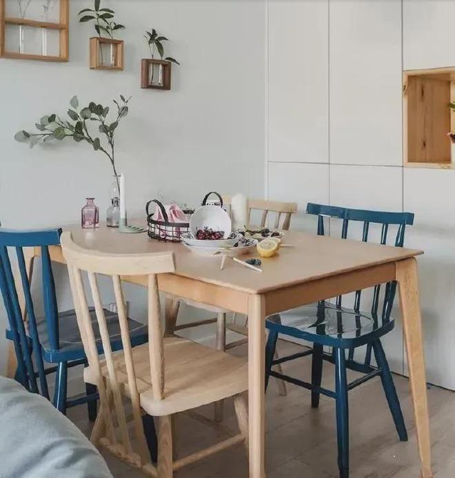 玄关鞋柜正对着的空间是餐厅,餐厅的设计更简单,原木的餐桌放在中间,原木色和海洋蓝色的搭配,给人不一样的视觉享受,而且还非常的简约实用。