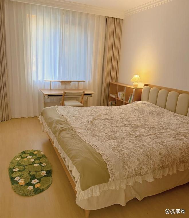 最后就是家里的主卧室啦,一张1米8的超大双人床放在中间位置,两个人躺也不觉得挤,靠窗的位置放书桌,旁边用半身矮架代替床头柜,既能收纳又能放阅读灯,一物两用更加节省空间。