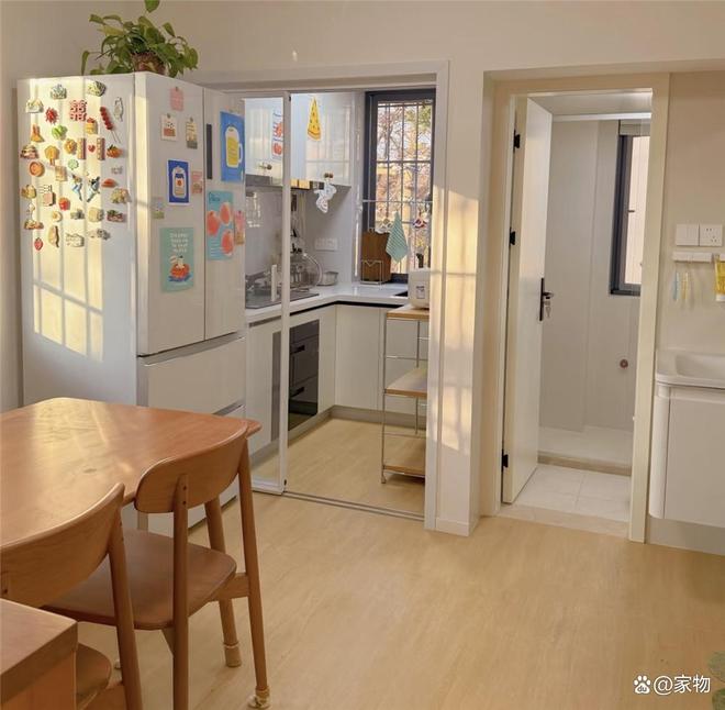 若分成三个空间的话,进门处便是家中的第一个空间,容纳下餐厅、厨房和卫生间,正如我上面所讲,没有玄关,而是将转角空间留给洗手台,用起来倒是方便。
