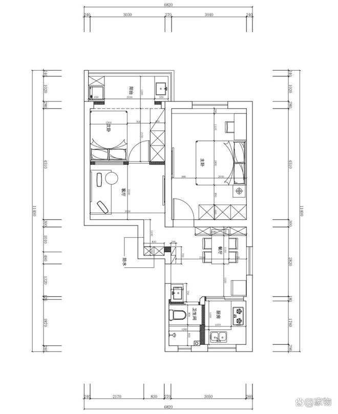 全屋整体户型其实并不算太好,转角特别多,而且大多地方很窄,像是缺了一角的长方形,十分考验空间利用能力。