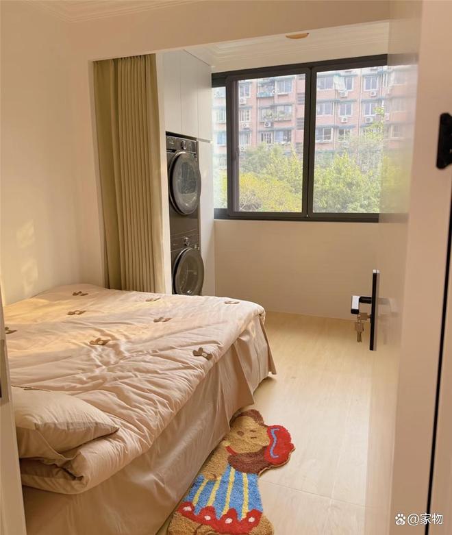 阳台一侧做洗衣柜嵌入洗衣机和烘干机,另一侧则放书桌当学习桌,小小的儿童房也算是功能齐全。