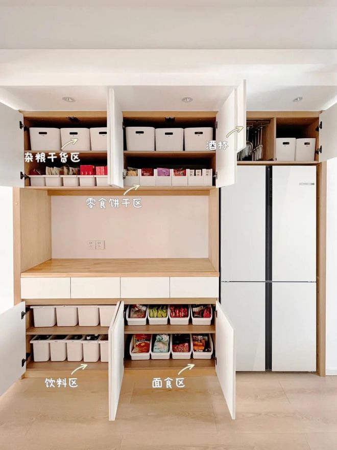 因屋主家已经有了充足的杂物收纳空间,餐边柜便以零食收纳为主,同时兼顾部分小家电的摆放与使用,生活动线更加丝滑合理。