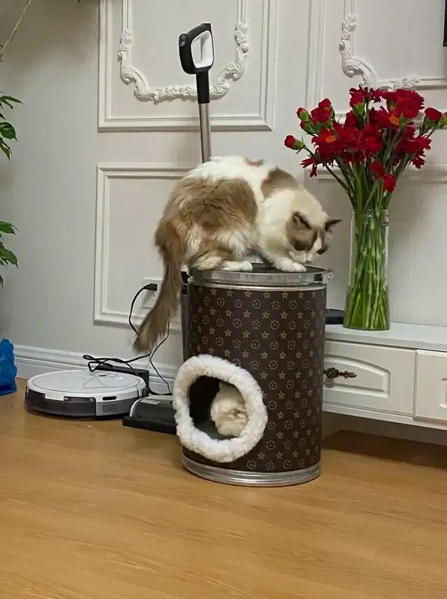 还可以用它DIY猫窝,在侧边开一个半圆门,里面放上小猫咪的玩具,这就成了萌宠专属的“别墅”。