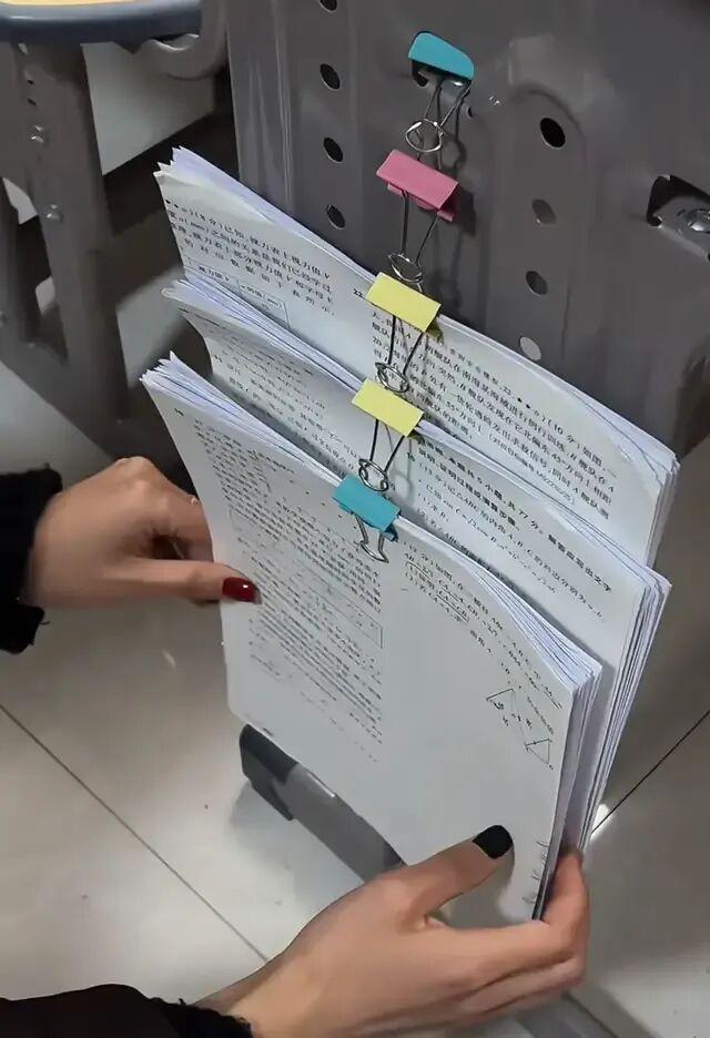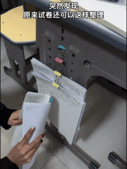 就算试卷再多也不怕,可以把长尾夹侧过来挂在上一个夹子上,这样一摞摞试卷就叠放起来了,很好整理,能够快速分类固定,而且成本还很低。