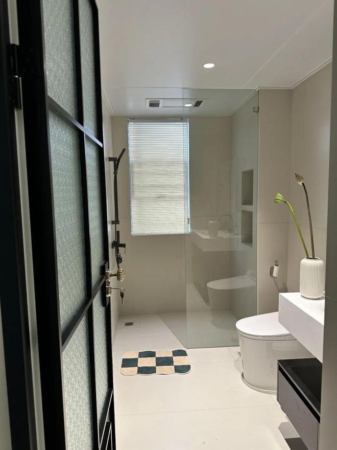 想象中:卫生间面积太小,做半块玻璃隔断,既不会让空间显得太堵,也兼具了防溅水的作用,视觉表现十分简洁。