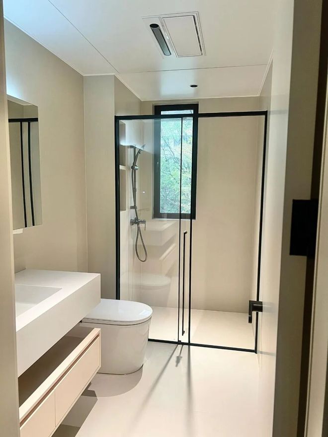 建议:淋浴隔断上方若未封闭,浴霸可以装在干湿区之间,可以确保空间温度均衡,且夏季的时候还可以当个风扇用。