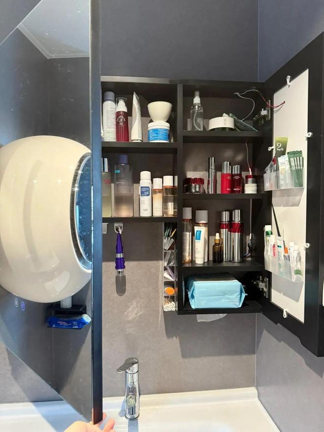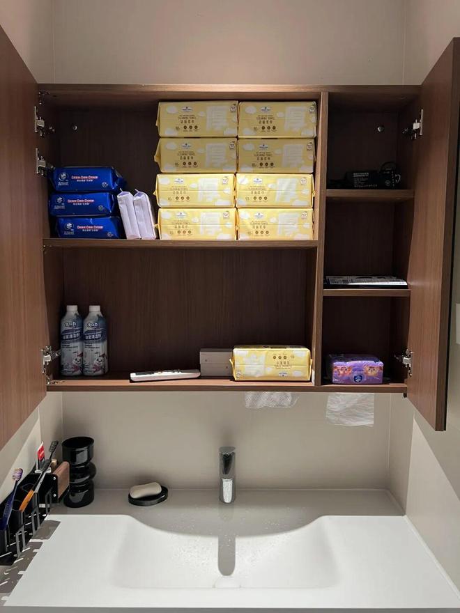 网友@君君呐:镜柜偷懒的结果,就是内部隔板层太少了,除了能放一些纸巾之外,化妆用品根本放不了多少,感觉空间被严重浪费了。