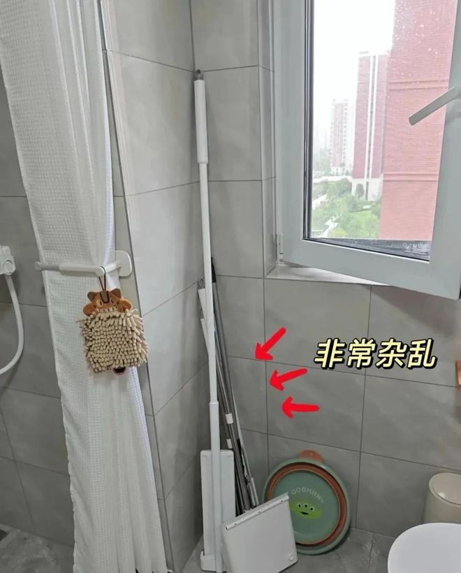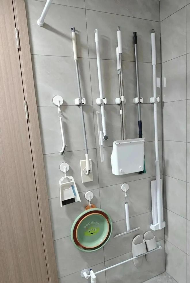 像拖把、小刮把等诸多的清洁工具,大多数家庭都会有,而且还都愿意放在卫生间里存放。