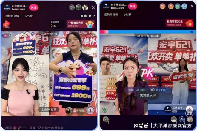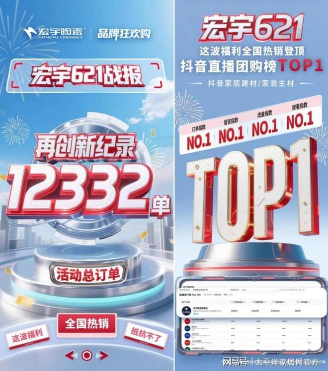双11期间,宏宇陶瓷首创“短直融合+团播互动”模式,组建星主播团,以9125单、3763万全网曝光、1143场门店直播的战绩横扫抖音相关榜单TOP1,六项核心数据位列第一。