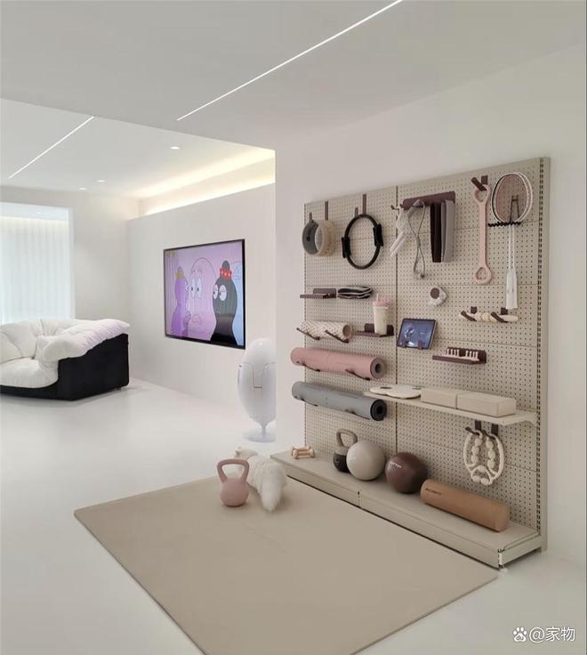 泡沫轴、壶铃、拉伸带等各种家庭运动和瑜伽器材都整齐收纳在墙面洞洞板上,不仅拿取方便,同时看着也很整洁干净,甚至还有个专门挂PAD的地方,可以边运动边追剧,或许这也是极简少物后,才能实现的家居场景吧。