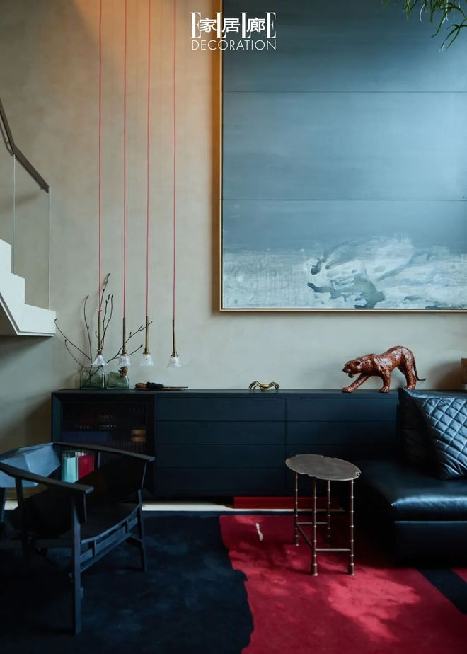 客厅的黑色边柜和铜制茶几都是崔树的设计手笔。