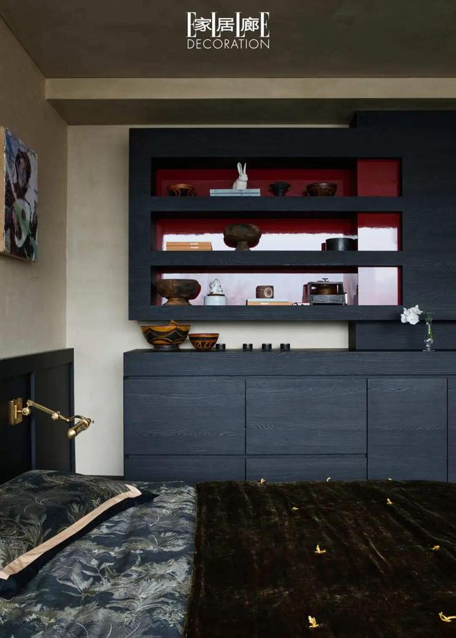 在为这套家设定“15年不过时”的前提下,崔树最先确定的,并不是风格,而是配色的比例关系。这个判断,来自他对中国传统字画的长期观看经验——空间打底60%的色调来源于宣纸的浅米色,30%的黑色则像墨迹,用来定势结构,红色只在极少的10%中出现,作为印章般的收口。这种清晰的比例,让空间耐看,也让它在时间里保持松弛。