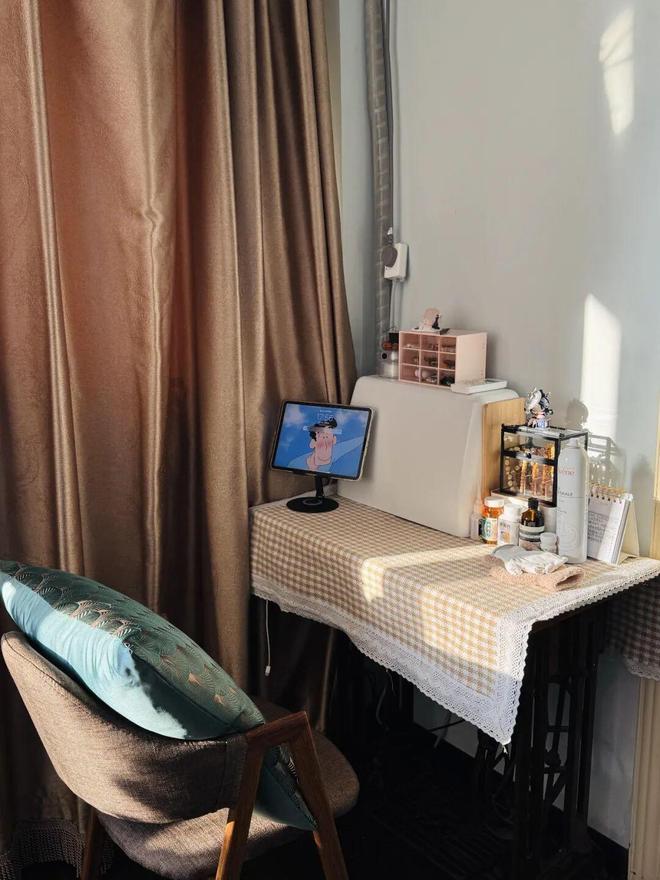 同样不需要过多的改造,只需要铺一块桌布,再搭配一些收纳盒,就能满足日常梳妆需求。