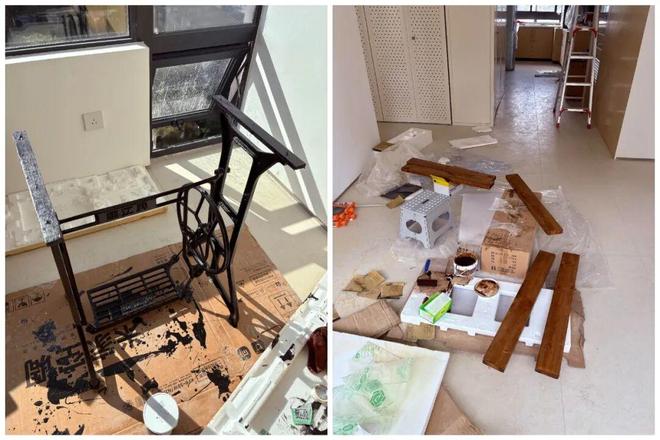 改造起来并没有多少难度,只需要将缝纫机拆掉,只保留铁架部分,再买几支防腐木打磨刷油,并铺到铁架上。