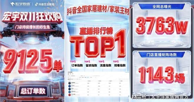 双11期间,宏宇陶瓷首创“短直融合+团播互动”模式,组建星主播团,以9125单、3763万全网曝光、1143场门店直播的战绩横扫抖音相关榜单TOP1,六项核心数据位列第一。