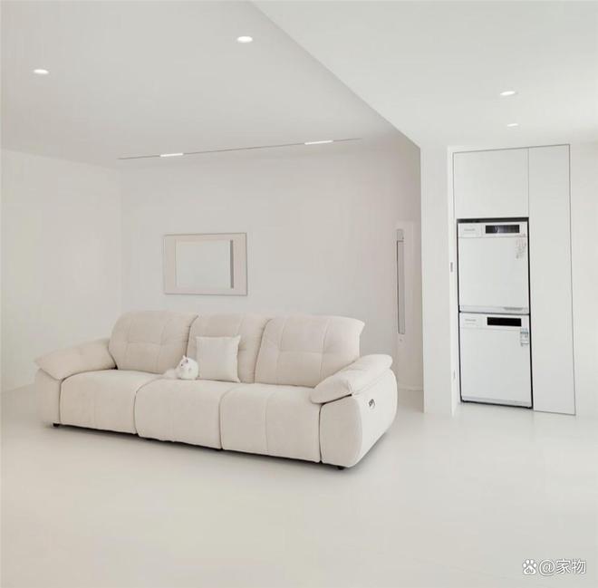 沙发和周围空间,依旧是白茫茫一片,三人位的沙发不靠墙,反而显得有些孤零零地,而洗衣机和烘干机巧妙嵌入到了阳台的通顶式洗衣柜里,看起来整洁干净,与周围白色调装修相互融合,没有丝毫违和感。