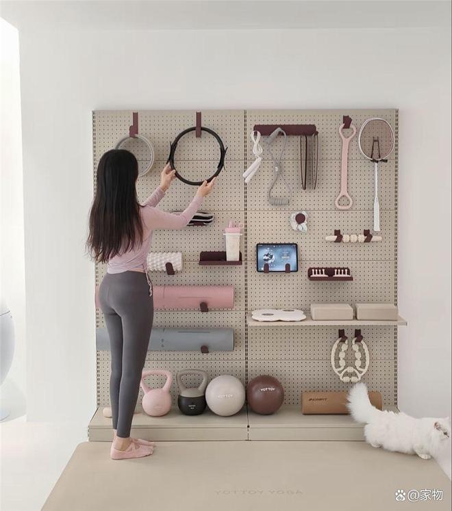 泡沫轴、壶铃、拉伸带等各种家庭运动和瑜伽器材都整齐收纳在墙面洞洞板上,不仅拿取方便,同时看着也很整洁干净,甚至还有个专门挂PAD的地方,可以边运动边追剧,或许这也是极简少物后,才能实现的家居场景吧。