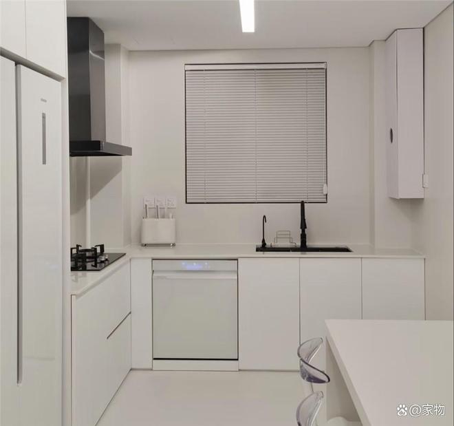而厨房里,自然也是延续了家里一贯的白色调装修风格,从橱柜到墙面瓷砖再到洗碗机,统统做成了白色,只是油烟机、水槽、灶台作为点缀的重点色用黑色调,背白搭配更显层次感。