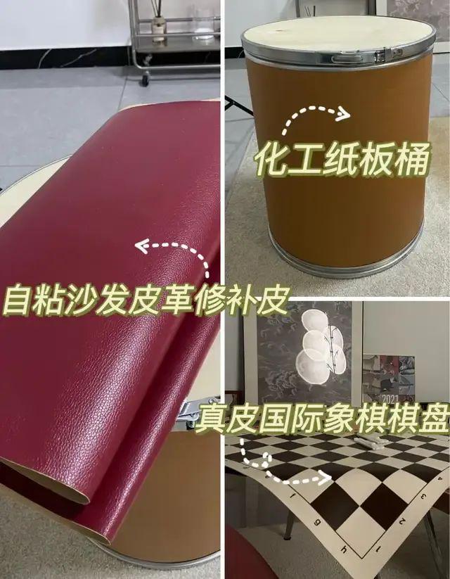 具体做法是:先用自粘的红色皮给纸桶贴上外皮,再把真皮象棋棋盘按照桶顶部面板的大小裁剪好并固定住,这样就完成了,既稳固又美观,质量还很棒!