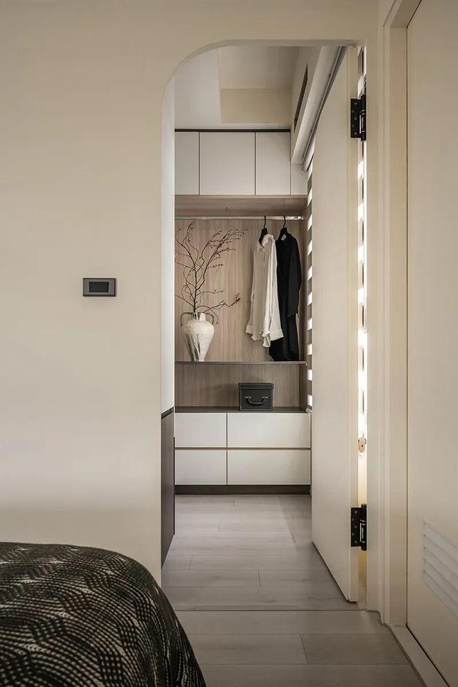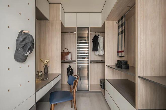 更衣室柜体面宽加宽至 120 公分,以开放式吊挂为主,下方配置抽屉存放隐私物品,靠近门口的柜体採「一柜两用」,兼具放污衣篮空间,集中待洗衣物,以及挂帽子的洞洞板。