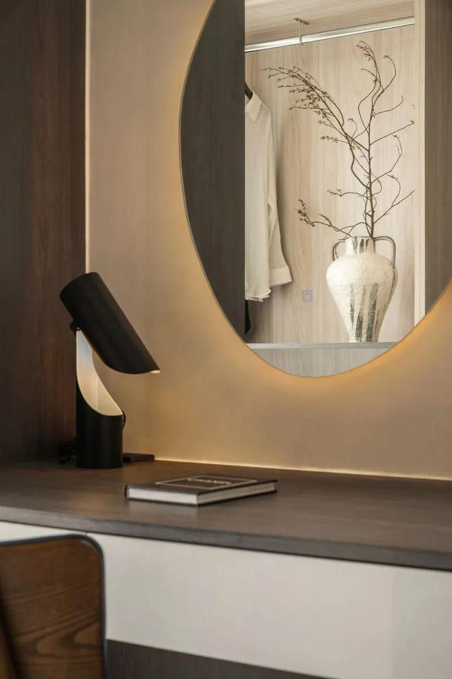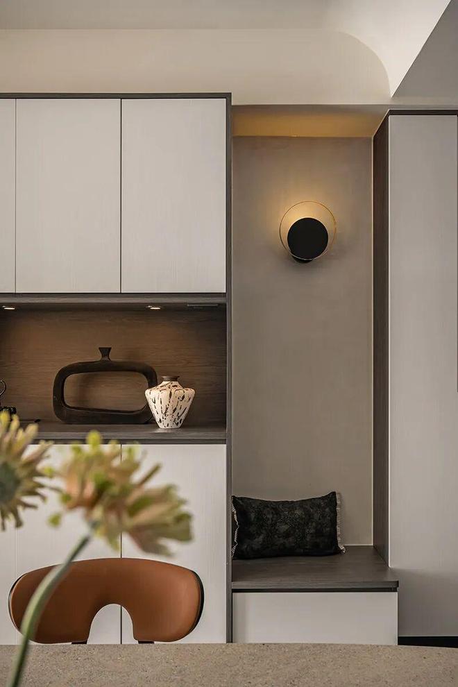 玄关以灰色涂料搭配壁灯,轻透柔和暖黄光氛