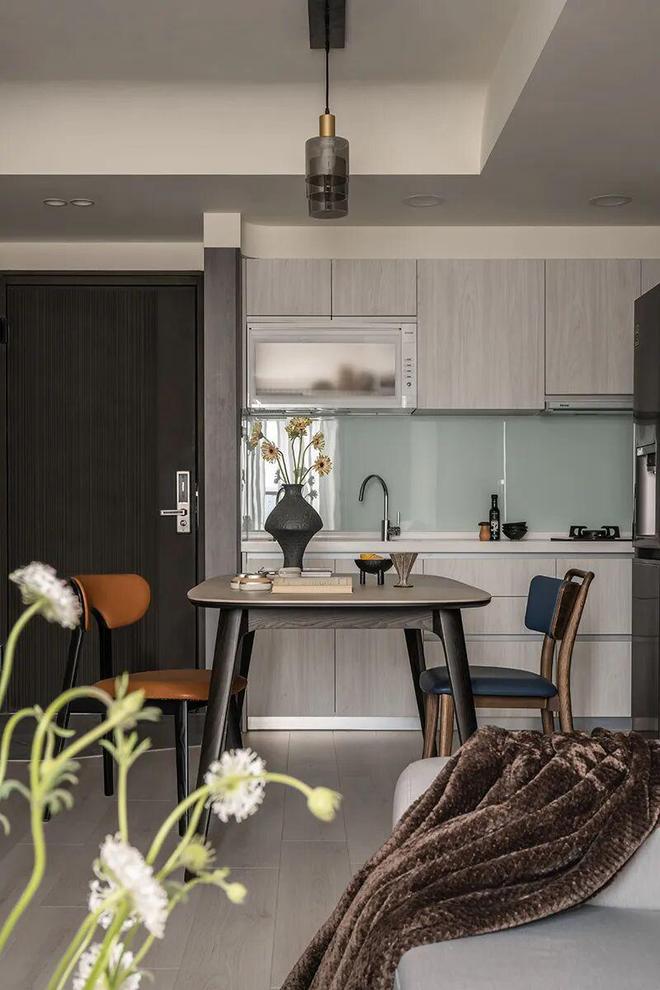 与高饱和度的橘、蓝餐椅形成视觉对比
