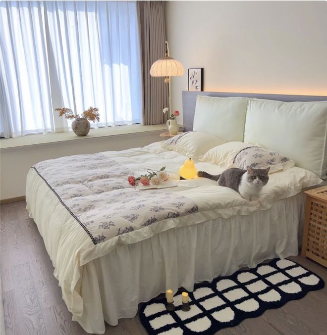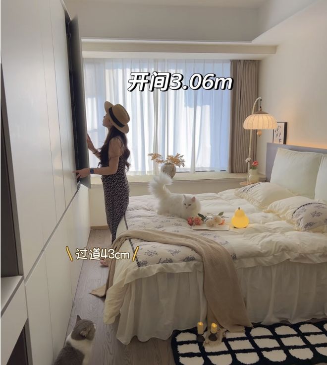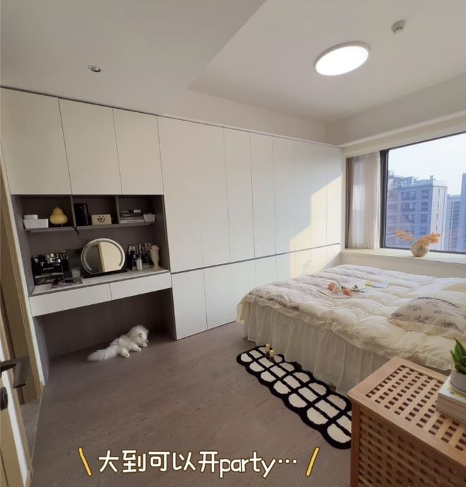 但最近,我却发现了一位杭州女生的卧室(@阿丢的家),将整墙衣柜做到了卧室床尾的位置,不仅不会拥挤,反而还让整间卧室显得宽敞明亮了不少。