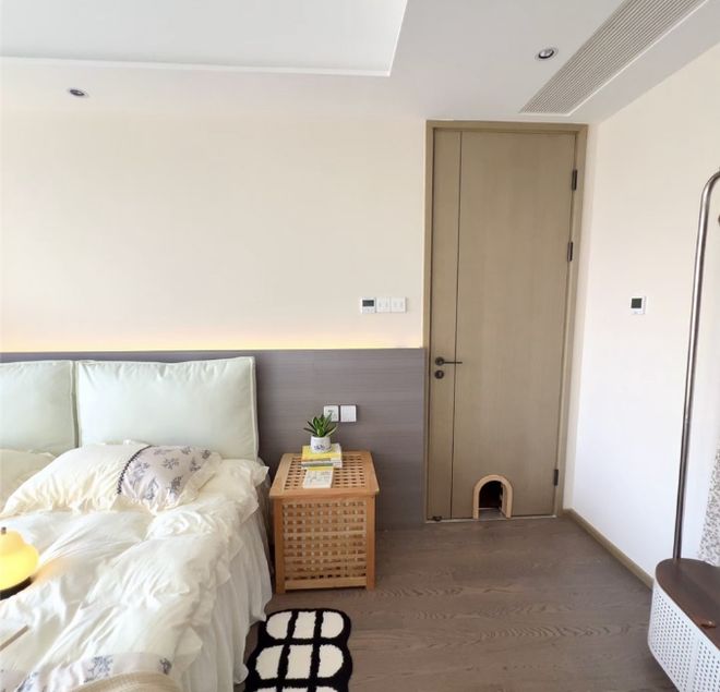 进入室内,可以看到床尾这一整面墙的通顶定制大衣柜,不仅整整齐齐,还有充足的收纳空间,可以说是半平米都不曾浪费掉,而且尺寸刚好填满床尾的冗余墙面空间,嵌入一张梳妆台也绰绰有余。