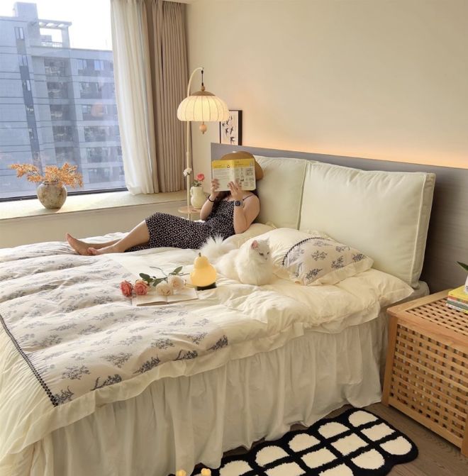 除了这窄过道外,床头柜、落地灯、飘窗一应俱全,让卧室生活功能更加完整。