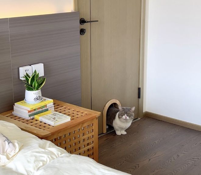 家里养了两只小猫,为了能在晚上睡觉休息时正常关门,又不影响小猫进出,干脆就在门下方掏了个拱形猫洞,小猫可以自由进出,又有趣又方便,还有点“猫和老鼠”里面那种场景的感觉呢~