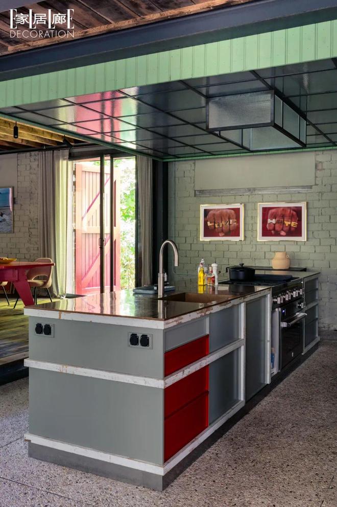 厨房更是将Erik的可持续理念发挥得淋漓尽致,他强调设计应在生态效能与美学价值之间取得平衡,他邀请欧洲可持续艺术和设计领域的领军者之一、擅长以废弃木材展现工艺技术的荷兰设计师 Piet Hein Eek一同打造厨房,采用再生木材(如经过改造的旧窗户)与长条形中央岛台相结合,岛台中设有绿蓝双色漆面金属储格,与刻意裸露的工字钢梁一同表达对材料本身的尊重。