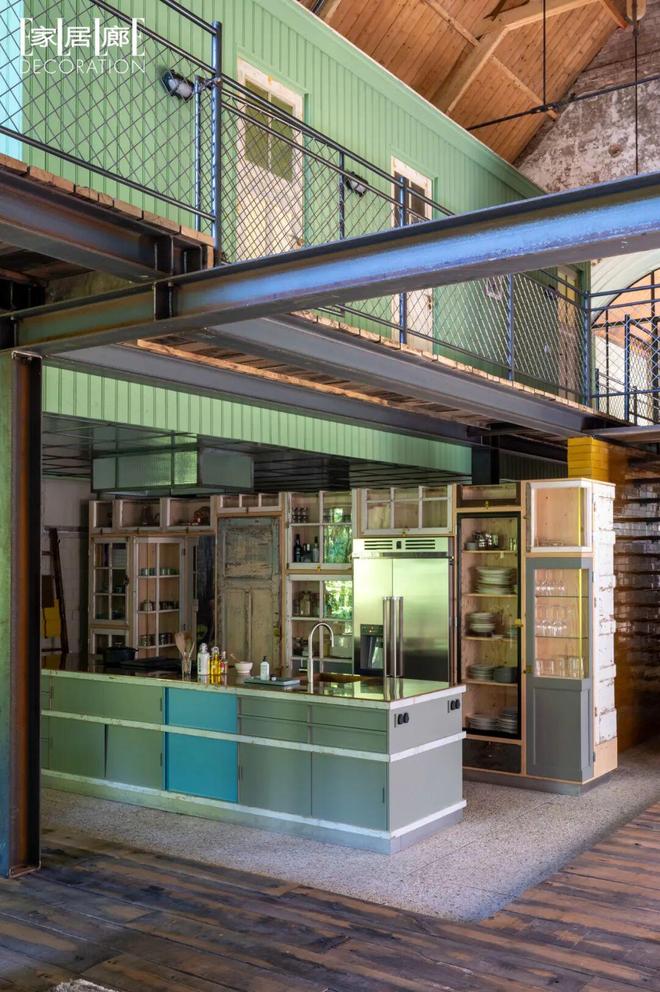 得益于出众的挑高,起居空间被自然而然地划分为接近几何形状的区块,通过顶部的钢结构支撑的二楼空间,设有电视休息室、三间儿童卧室和浴室,统统被浅绿色漆面木壁围住,形成一个集装箱式的长方体,木壁上嵌有现代感的壁灯。旧木地板、金属储物柜、斑驳的墙面与拱门下的玻璃门,此处的视野构成迷人的空间叙事。