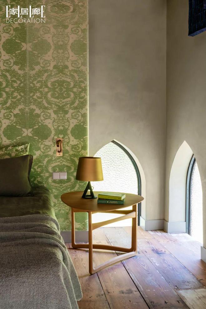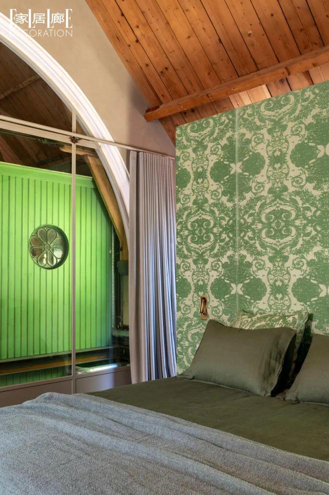 通过客厅上方的吊桥进入走廊,尽头处是为父母提供的主卧室,视野上享有屋顶下的开阔层高,也可以从两扇小窗看到屋外的风光。为保护隐私,Erik Gutter定制了纤薄金属框架的玻璃拱门,床头墙面以素雅的浅绿色提花织物包裹,与草绿色床头柜、灰绿色被单枕套浑然天成,描绘出深深浅浅的的绿意,依然贴近周边自然环境,金色壁灯则为休憩空间注入低调的奢华。