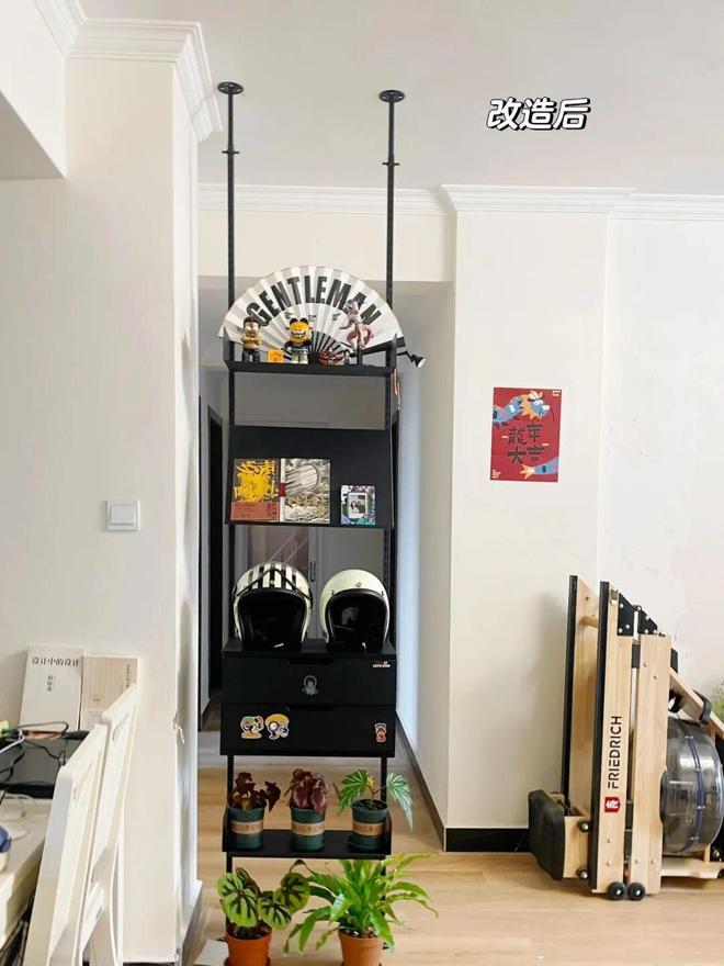 最后综合空间尺寸,在不影响过人的情况下,定制了一组顶天立地置物架,安装在过道入口处。