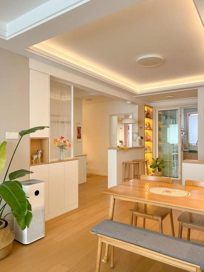 至于我家的垭口为什么这么宽,自然是砸出来的,再顺势做个隔断吧台,刚好与隔断柜对称,而背面则是一块开放式办公区。