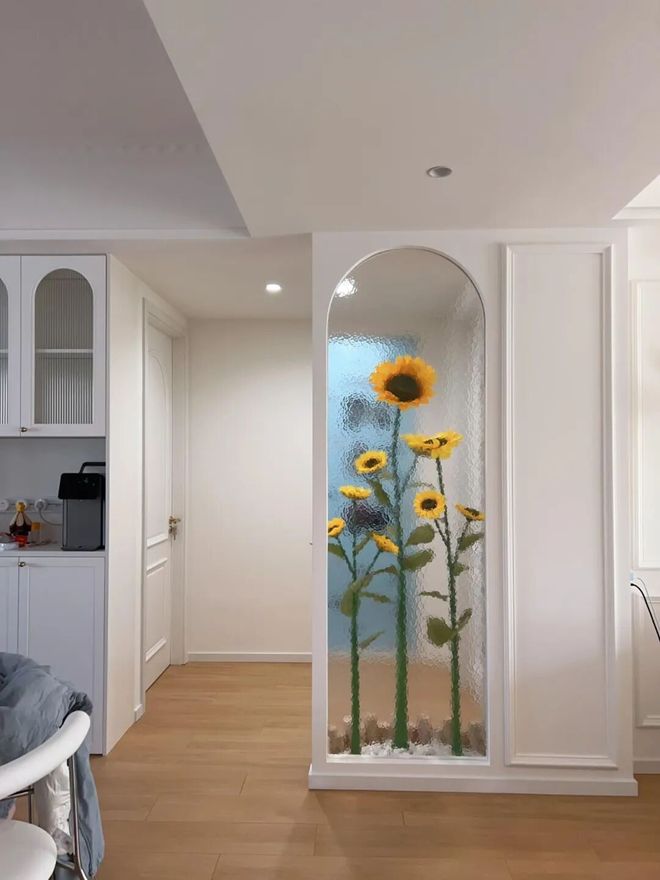 拱形框是找木工师傅做的,油画玻璃不需要用拱形,背面用木柱+石子+仿真向日葵,做了一个小花池,太治愈了。