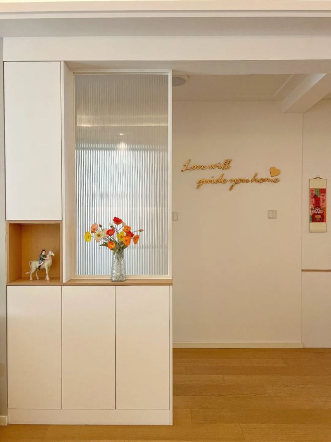 网友@清清子:装修最满意的地方,就是这块油画玻璃隔断了,在遮挡卫生间的同时,也为入户造了一个美美的小景。