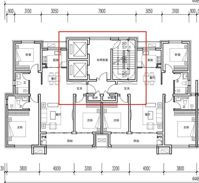 如上面所说,不是所有的两梯两户住宅都有一块独立的前室,还有不少楼盘会设计“合用前室”。