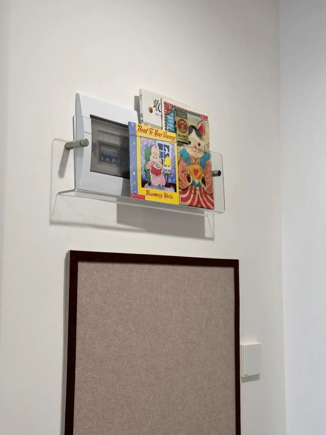 其实它也可以用来遮挡强电箱,只要用膨胀螺丝固定住,再放几本绘本遮挡一下即可。(打孔时注意墙体内的电线)